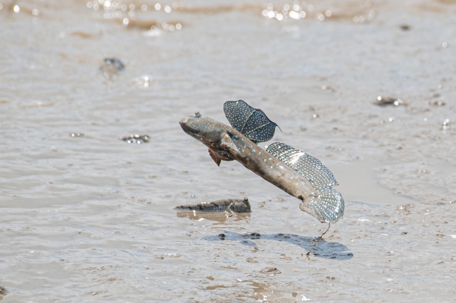 ムツゴロウは胸びれを前脚のように使い、干潟で活動します。