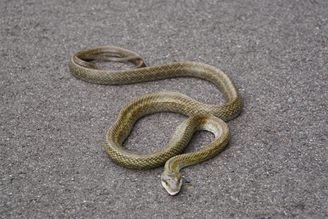 - アオダイショウ(成体):全体はオリーブ〜茶緑色の単色調で艶がある。腹側は淡色。